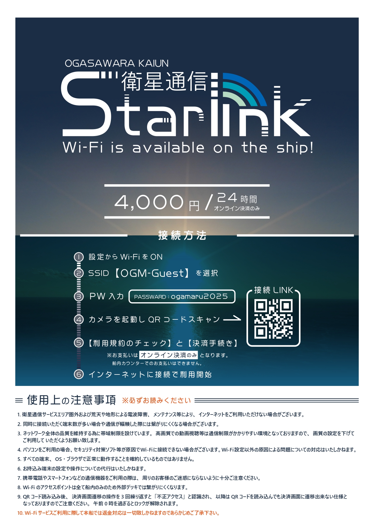 低軌道衛星Starlinkを活用した船上Wi-Fiの有料サービスをおがさわら丸にて開始しました。