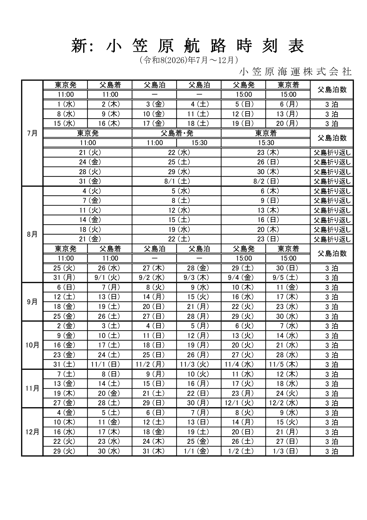 【速報】2026年7~12月おがさわら丸時刻表(10/9発表)